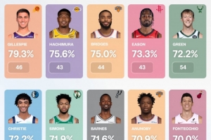 注:至少出手40次接球投篮;有效命中率=(命中数+0.5×三分命中数)/出手数