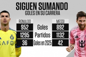 C罗生涯1295场比赛打进952球,其中2025年打进36球;梅西生涯1132场比赛打进892球,其中2025年打进42球。